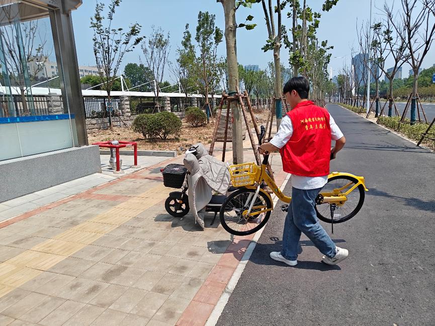 活动过程中,志愿者们分工明确,一部分队员负责清扫街道,他们细致地清理着每一个角落,从落叶枯枝到不起眼的纸屑,都不放过,让校园周边环境焕然一新。另一部分队员则专注于整理杂乱无章的非机动车停放区。面对排放不整齐的电动车,他们没有丝毫抱怨,而是耐心地一辆接一辆地挪动、排列,确保每辆车都整齐有序地停放,既美观又方便行人通行。