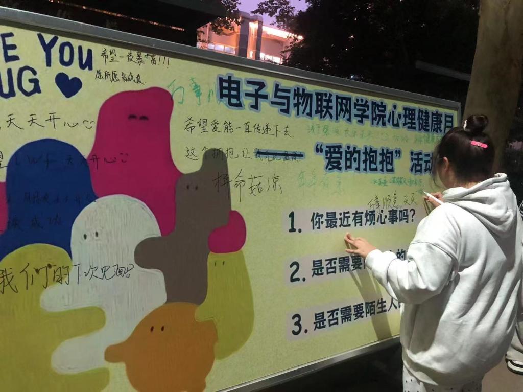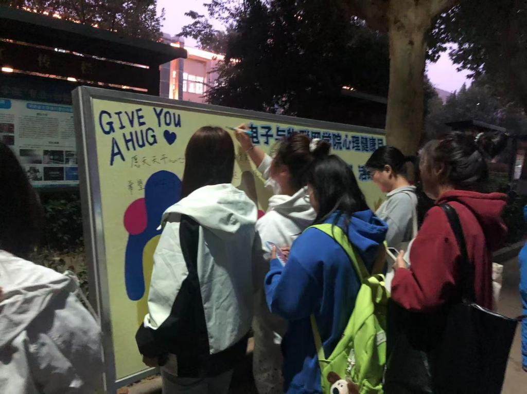 活动现场,同学们颇有兴致。他们开心地张开双臂与“NPC”拥抱,脸上绽放出阳光的微笑。拥抱过后,同学们纷纷在活动展板上写下自己的“心语”、“心愿”。