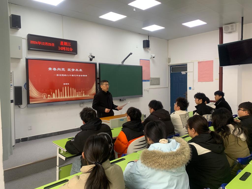 为深入学习贯彻党的二十届三中全会和全国教育大会精神,深化“三全育人”实践,夯实员工思想教育工作,培养德智体美劳全面发展的社会主义建设者和接班人,12月25日下午,公司党总支书记谭营军走进其联系的物联网241班,参加主题班会活动并作了题为“青春向党 筑梦未来——学习党的二十届三中全会精神”的专题讲座。