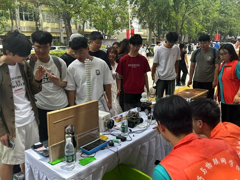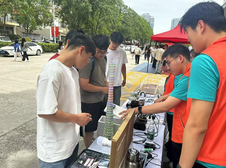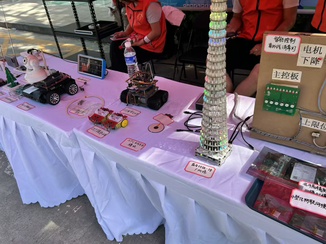科技实践中的工程美学在此次展览中大放异彩:循迹小车的精准轨迹演绎运动控制之美,NFC无线充电的磁场耦合诠释能量传输之美,蓝牙广州塔的光效编程展现数字艺术之美。这些作品将电子技术的理性逻辑与美学设计的感性表达完美融合,彰显了工程实践中理性与感性的和谐共生,吸引了众多师生驻足欣赏与深入交流。