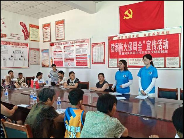此外,志愿服务团的师生积极参与睢县城关镇开展的反邪教进村教育和夏季防溺防火宣传活动,王蕊老师结合高校真实案例对邪教的传播特征、危害和防范方法进行详细讲解,赵甜语、陈丽君同学结合家庭生活场景为村民普及夏季防溺防火要点。