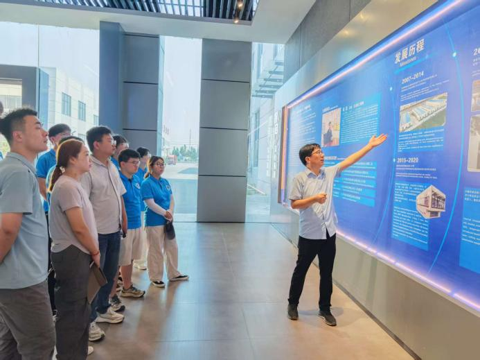 第二站,志愿服务团来到河南鼎能电子科技有限公司。该公司是一家致力于新能源智能装备和非标自动化设备的研发、生产为一体的国家高新技术企业。在该公司总裁助理范高伦的接待下,同学们首先在展厅观看了企业纪录宣传片。随后,范高伦向同学们详细介绍了企业发展历程、所获荣誉、核心专利,等内容。在车间里,范高伦带领同学们参观了锂电干燥工艺的生产过程和精密的新能源电池干燥线产品。