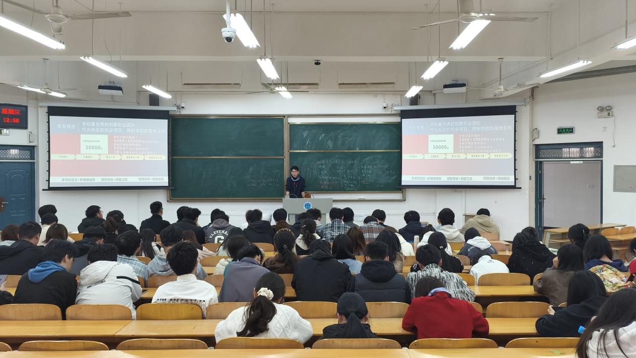 在分享过程中,孟荣恩结合自身经历,从创新创业参赛经历讲起,详细阐述了项目从选题、技术研发、团队协作到最终参赛的全过程。“一个好项目,不仅要有创新性,更要解决实际问题。”孟荣恩说。他鼓励同学们要敢于尝试,勇于创新,将专业知识与实际问题相结合,找到自己的兴趣点和突破口。