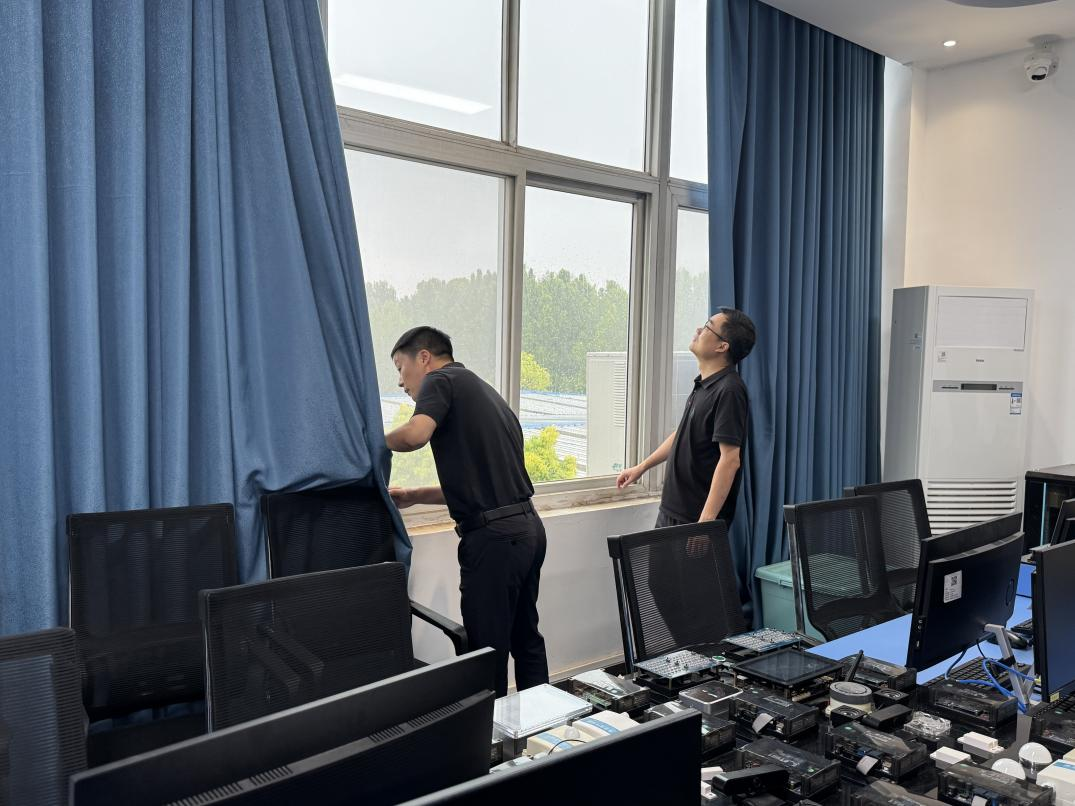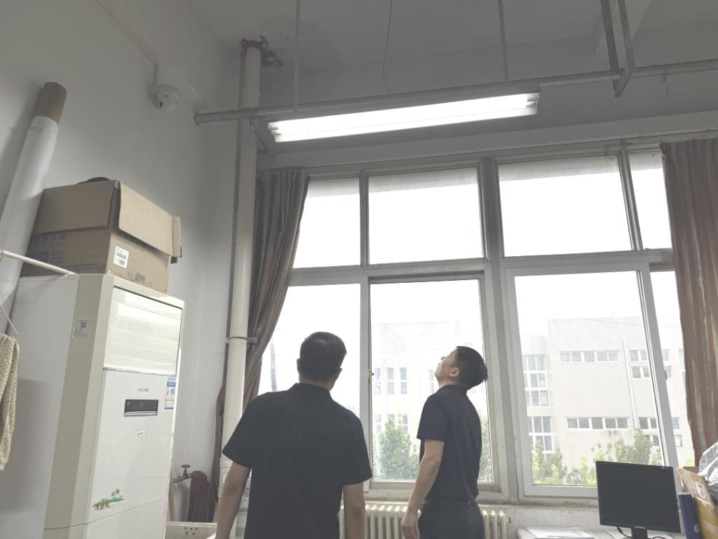 本次检查覆盖智行楼和合鼎楼所有实训室,重点检查门窗的密封性、合页及锁具完好情况,查看是否存在缝隙、松动等易渗水问题;查看天花板水渍、墙面返潮痕迹、吊顶接缝处状况等,排查漏雨隐患。
