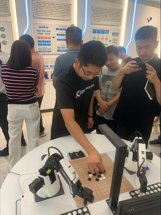 在副经理董延的引导和解说下,公司领导和老师们走进数控技术成果展厅。通过对各个展区的参观和学习,老师们对数控技术专业群在党建引领、教学模式、课程创新开发、产教融合实践等方面的内容成果有了深入细致的了解。在参观过程中,人工智能五子棋机器人吸引了老师们的兴趣,其智能化的操作、精准的判断以及与对手的互动体验,引得一众老师围观并对弈。