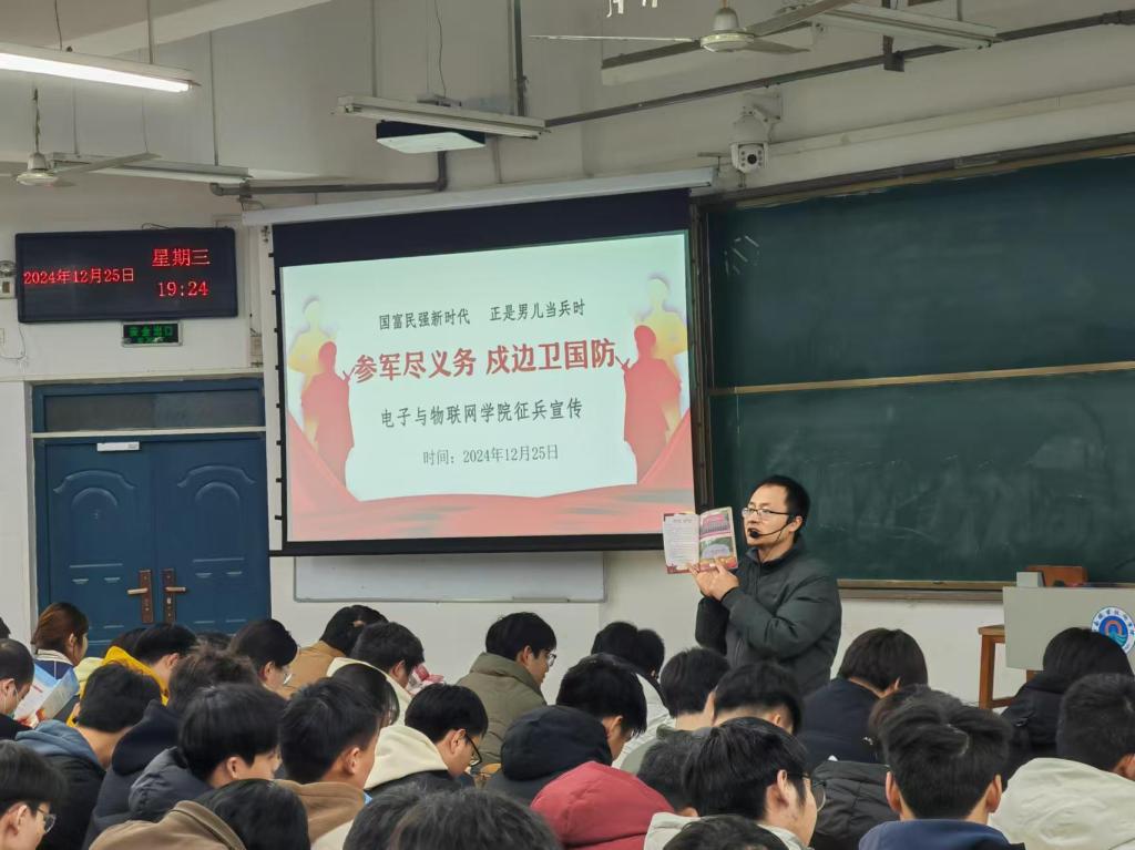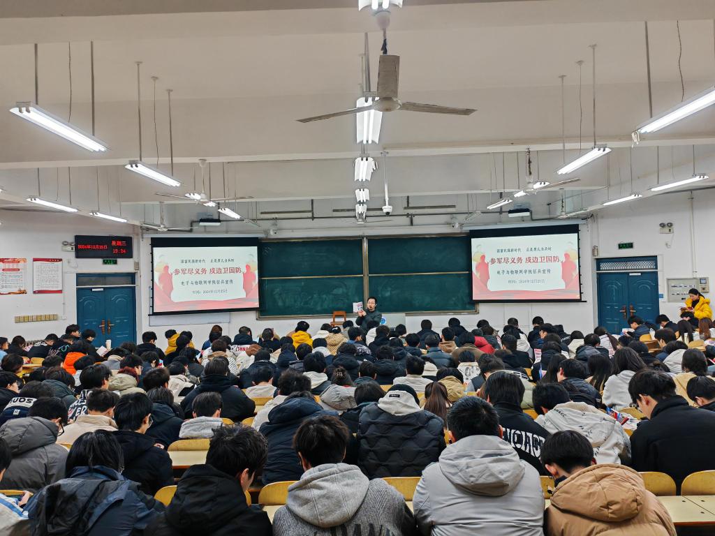 为响应党和国家号召,扎实推进公司2025年老员工征兵工作,激发老员工参军热情,12月25日晚,公司在明理楼1101教室举办了“参军尽义务,戍边卫国防”征兵宣传讲座。校学工部武装部办公室主任刘明库应邀作为讲座的主讲人、郑州爱尔眼科医院王静医生应邀作为嘉宾参加此次讲座活动。讲座由公司辅导员王蕊老师主持,辅导员王率帅老师和刘云杰老师参加。