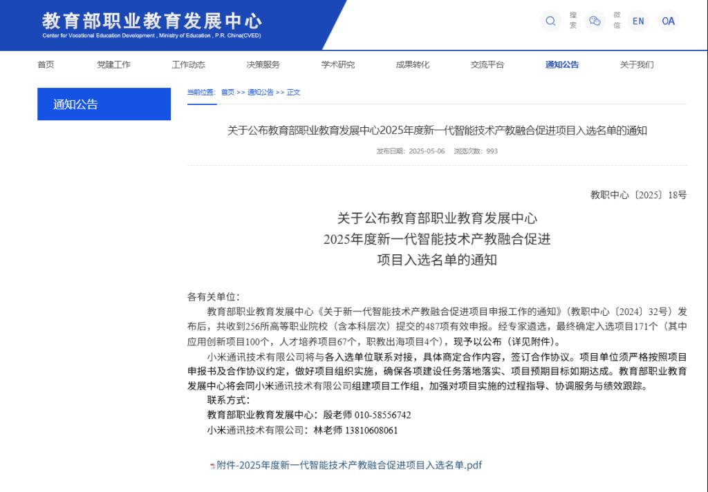 近日,教育部职业教育发展中心正式公布了2025年度新一代智能技术产教融合促进项目入选名单。公司申报的《“职米智匠”新一代智能技术产教融合人才培养项目》,在全国256所高等职业院校(含本科层次)提交的487项有效申报项目中脱颖而出,成功入选。